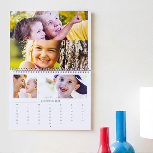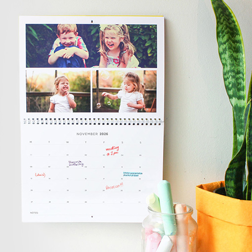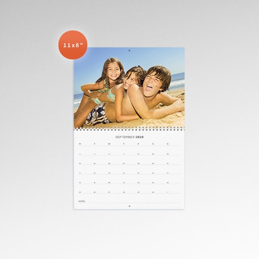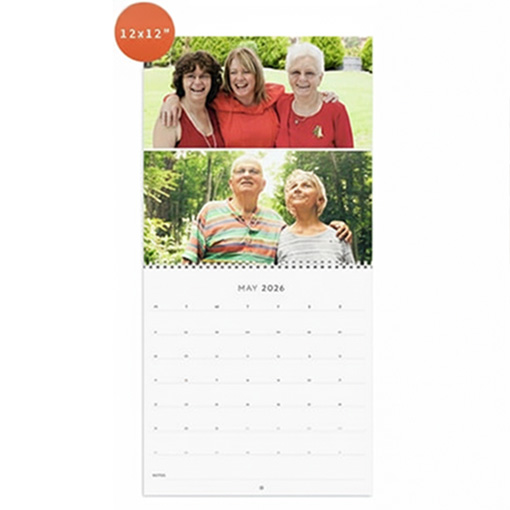 Spiral wire bound, opens to a beautiful double page spread featuring your photos on top and calendar grid on bottom. Conveniently placed hole for easy wall hanging.